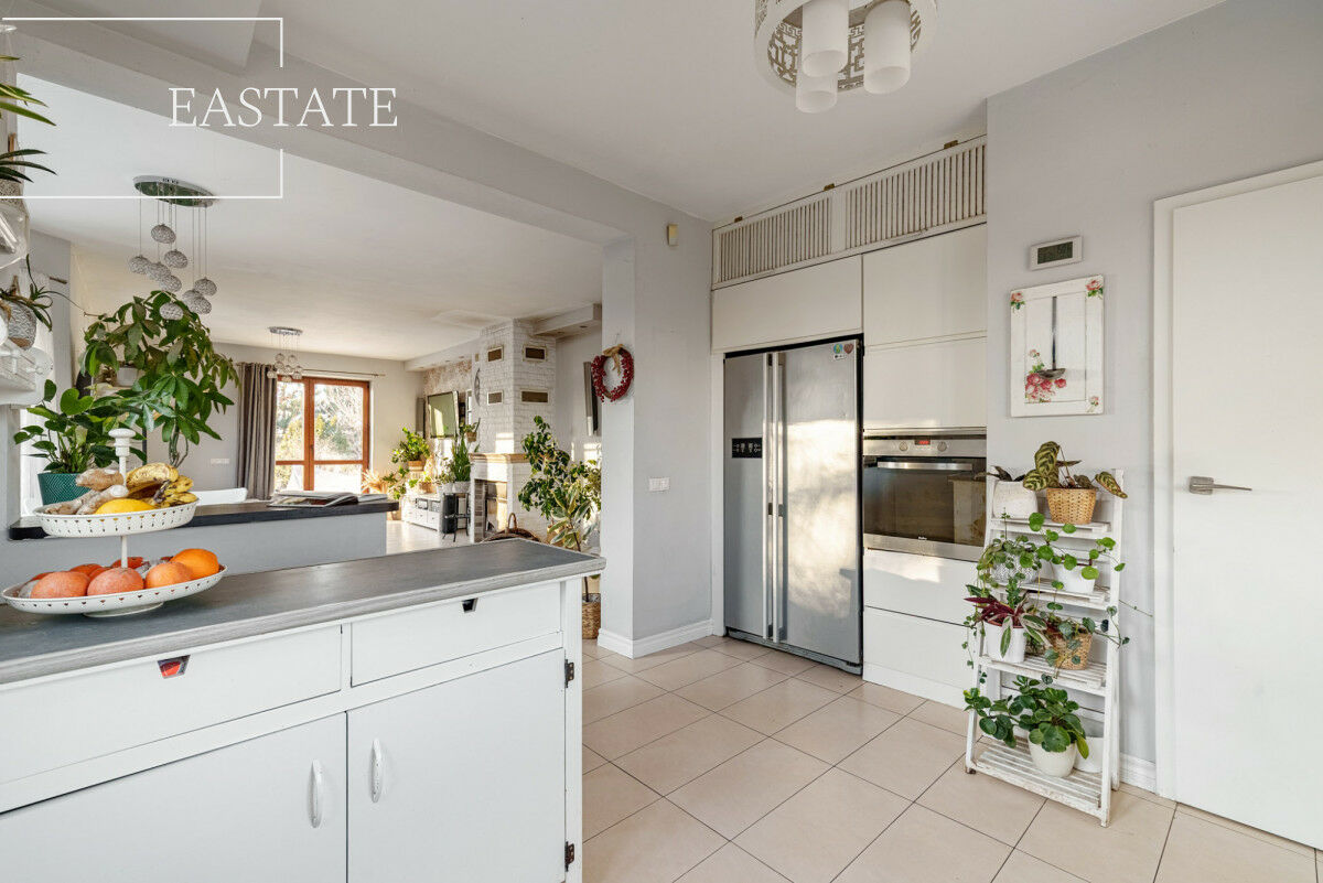 Strefa prywatna obejmuje cztery ustawne pokoje, każdy z miejscem na dużą garderobę, oraz przestronną łazienkę z narożną wanną. Pomieszczenia są doskonale doświetlone dzięki dużym oknom, z których rozciąga się widok na starannie zagospodarowaną zieleń posesji oraz okoliczne tereny otwarte i pola, co dodatkowo potęguje poczucie przestrzeni i spokoju.